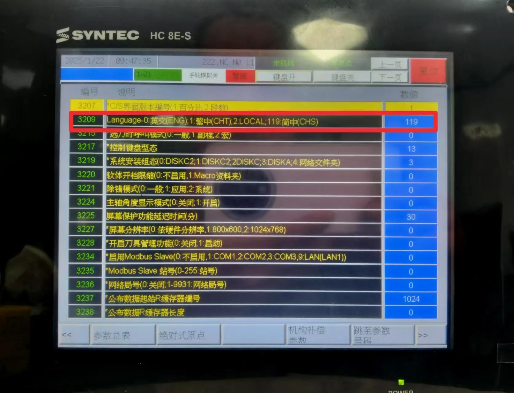 The steps for switching system language are shown in the figure above: enter the electronic control module → parameter settings → jump to parameter number 3209, and modify the values after 3209 to change the system language. The value 0 represents English, 1 represents Traditional Chinese, 119 represents Simplified Chinese, and 176 represents Korean.